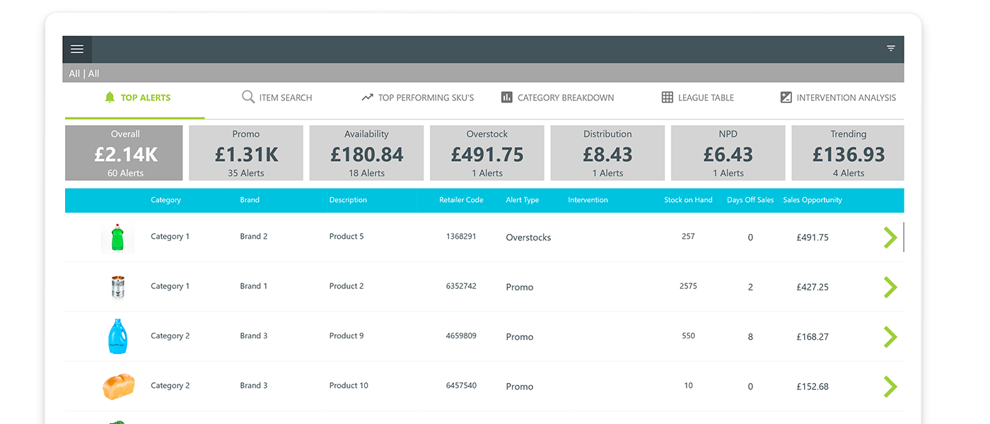 Quickly identify issues in your supply chain or distribution, spot trends across the estate or in geographical locations, resolve issues and direct sales teams to the biggest opportunity stores, detailing exactly what interventions to take to sell more.